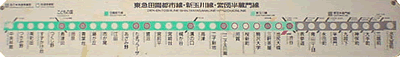 玉川線で使われていた客用ドアーの上に掲げている「路線図」。電車とバスの博物館の部品即売会で購入したもの。安かったと思う。三越前までしか行っていなかったのが水天宮まで路線が延びて、水天宮を貼った応急的なもの。ちゃんと水天宮を印刷したものができたので不要になり、即売されてのだろう。今は息子の部屋のアクセサリーになっている。そう言えば行き先方向幕もいっしょにかったはず……。