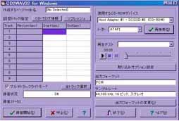 Windowsの方がいろいろな CD-ROMをWAVEファイルに変換するフリーソフト。 WAVEファイルのままだと ものすごく大きくなるのでびっくり。 MP3にすると10分の1くらいのサイズに小さくなる。 1分の曲で約1MB。 圧縮ソフトを使えば小さくなって フロッピーに入るかなっと思ってやってみたけど、 ほとんど効果なし。 そうか、MP3は圧縮されているんだと気が付いた。 |