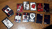 うんすんカルタはいろいろな「めくり札」に変化・発展して日本独自のデザインが加わり、して「賭博専用の札」も生まれた。これが流行ったために禁止令がでたのかもしれない。「大石天狗堂」と「田村将軍堂」ではいろいろな賭博札があった。遊び方は全く不明。左上は、東映任侠映画で見たことがある。
