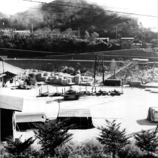構内をフォークリフトが急がしそうに行き来している。製材所の向こうに見えるのは吊り橋。
