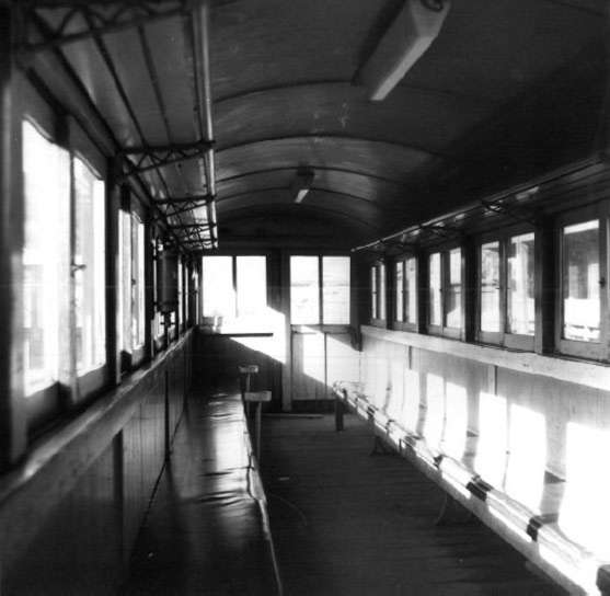両側にイスがあって、出入口は妻面。左に見える2つのポールは灰皿。