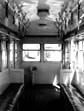 客車の室内。イスはビニール張り。ハンドブレーキが妻面に見える。