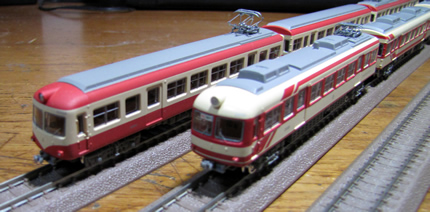| Nゲージで2000系は、グリーンマックスの名鉄キット加工で作成が可能だったので2編製作成。しかし近年2000系がいろいろな塗装で各社から発売された。 上の2つの編成はトミーテック製。左は鉄道コレクション第5弾のA編成。何度もポポンディッタに行ってやっと編成にしたら、右のオープンパッケージで「冷房車A編成3両セット(現行塗装)」が発売。「この後、D編成 リバイバルカラー 3両セット」も発売されて購入。 さらにマイクロエースから最後の、A編成のマルーン塗装とD編成のリンゴ塗装も発売されたので購入。しめて7編成が揃ったというわけ。 |