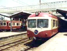 その後全車に国鉄直流特急車と同じ2色が採用され、特急車は前面の湘南形というか、金太郎の腹掛けのような塗り分けが目印に変わった。市街地立体化工事で無線アンテナが屋根に取り付けられ、方向幕が運転室に取り付けられたが、まだクーラーはない姿。 |