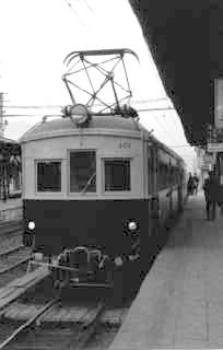 ほとんど自社発注だった「ながでん」の旧形車両の中で、初期の東武スタイルそのままで走り続けたのがモハ400系。他の古い車両も自動扉化工事を施し、ずっと市街地立体化まで元気に働いた中で、唯一手動扉だったのがモハ400系3両。また、ほとんど河東線専用のカタチで走り続け、特急が走り、新車が投入される長野線・山の内線、木島線からは手動扉のためか、河東線ならぬ下等線と野次られていた。ずっと手動扉だったのは、台枠が独特の車両のため自動扉化工事をやりにくい構造だっと聞いたことがある。 ●制御方式:EEC式電動カム軸式→HL制御車 荷物室を持っている車両が30番台になったときにモハ421はモハ411に。1000系の荷物室を客室に改造した車両を10番台としたため、これに合わせたのだと思われる。なお、モハ411・401は踏切事故で前面を破損し、貫通口がつぶされたので、正面窓は中央が高い凸形になっている。 |