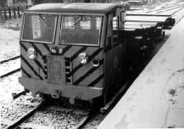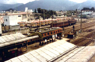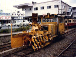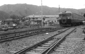 形式は不明だが、工事用の車両が写っていた。両方とも須坂駅のスナップ。左は駅が地下道がある頃だからかなり古い。うっすらと雪が積もっている中、枕木を運んでいるディーゼル。これも電車と同じクリームとレッドの2色に塗り分けられていた。 |