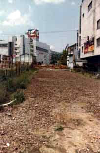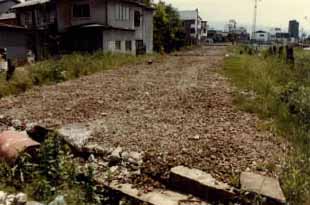 昭和56年3月1日に長野駅〜善光寺下駅は地下になった。レールが取り外された跡の地上部分を写したのが上の2つのカット。左は権堂駅付近、右は錦町駅方面を望む。今は大通りになって車が行き来している。 |