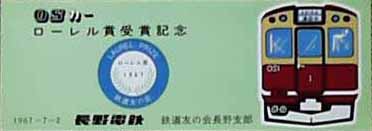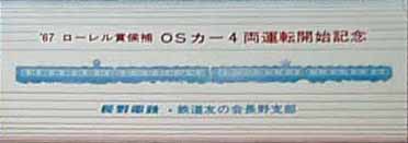’67ローレル賞受賞候補・4両編成運転記念」と書かれている。2色刷りの簡単なもの。ローレル賞候補になったので急いで印刷したのかな。下はカラー印刷で「1967−7−2ローレル賞受賞記念」のもの。車内にも円形のプレートが掲げられていた。そのOSカーも廃車されて今は走っていない。 |