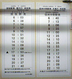 2002年夏、木島行き代替パスに乗る。乗客は4人。信州中野着の電車に接続している。バスは他の車に遠慮するかのように時々道路の幅の広いところで追い抜かせてゆっくり走る。停留所は木目柄が新調されていた。途中で乗ったのは1人。これでは廃止されても文句はいえない。料金は信州中野から木島まで520円。都会の均一料金に慣れているとかなり高く感じる。時刻表を見ると朝の通勤時間帯のみバイパス経由で、途中停車しないで走るので早く着くようだ。