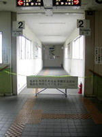 左:信州中野駅の木島線ホームに向かう跨線橋にはロープが貼ってあった