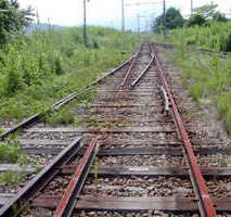 線路は錆びてはいたが草は思ったより繁っていない。架線もそのままだったから走らそうと思えば走らせることができる感じ。ホームから降りて雪覆いや保線小屋をのぞく。それから信濃安田駅方向へ歩いてみる。なぜか一ヶ所ポイントが外されていた。信号機は根元から切断されている。踏切まで歩くと道路から線路に入れないようにロープがはってあり、遮断機も根元から切断されていた。踏切のレールの間はアスファルトで埋められて、段差がないようになっていた。