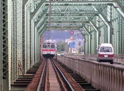 1926年(大正15年)に鉄道と道路の併設橋として完成。道路は2車線で歩道はなしで、何回か自転車やバスで渡りましたが、交通量は多く、自転車では正直怖いです。