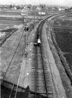 ![]() 旧塗装の200系が走り抜ける 電車の合間に、片方のレールに車輪を乗せた手押し車を引いて、線路点検をしている様子に出会ったのが右。 |