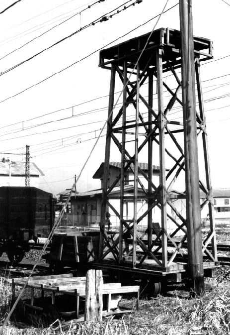 大きな画像でアップしたのは、手前のレールから外された台車の下にいる「ネコ」が見えるかなっ、と思ったから。柳原駅の片隅に架線点検用の木造台車が置いてあった。これもレイアウトを作ったときにいいかも、と思って撮影したもの。無蓋貨車との間の木造4輪台車も面白い。 |