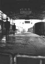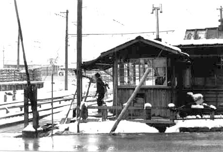 地下駅になる前の権堂駅の須坂方向の踏切。小さな小屋があって、旗を持った女性の踏切手がいた。右の裏は、長野電鉄の観光バスの発着所になっていて、さらに進むと本社・権堂駅に通じていた。ここも線路が地下になり、現在は長野大通りという名称になって、広い道路が走っている。権堂駅のあった場所も現在は長電権堂ビルになりイトーヨーカドーが入っている。 |
